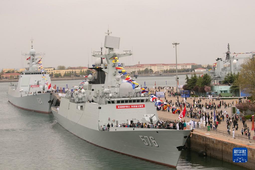 海軍在山東青島港3號碼頭組織艦艇開(kāi)放活動(dòng),導彈護衛艦大慶艦(前)和導彈驅逐艦開(kāi)封艦在靠泊展示(4月22日攝)。新華社發(fā)(孫飛 攝)