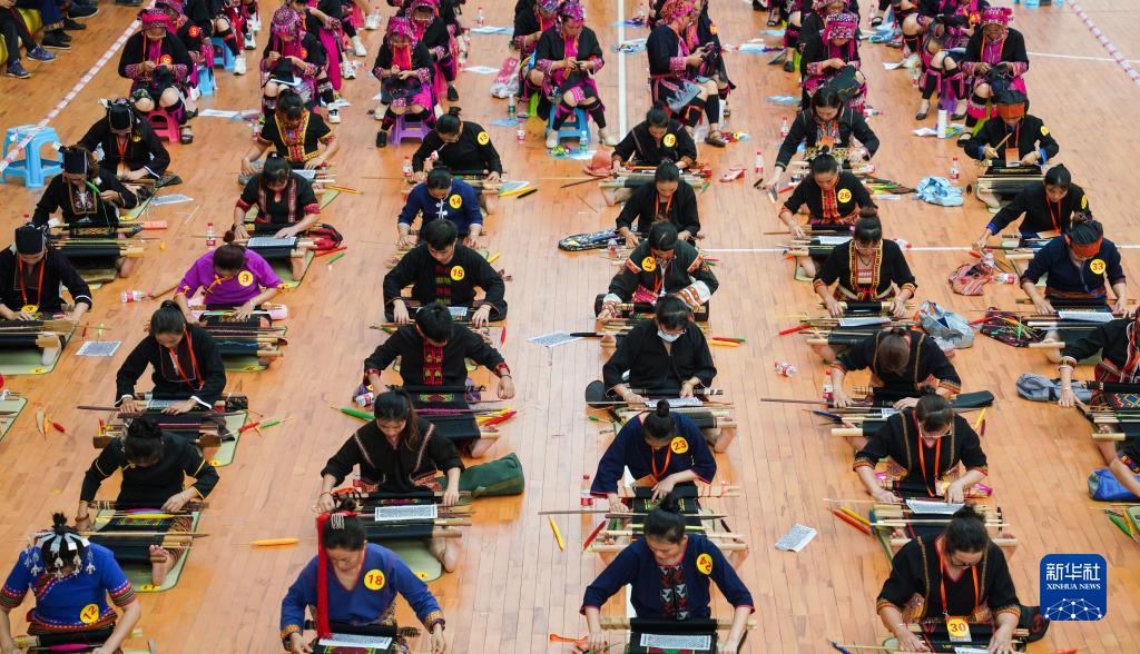 4月23日在海南省樂(lè )東黎族自治縣拍攝的黎錦苗繡技藝比賽現場(chǎng)。
