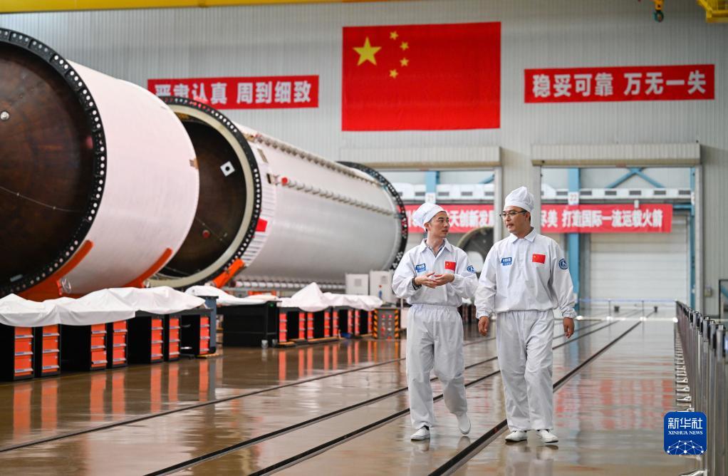 在航天科技集團一院天津火箭公司總裝測試車(chē)間,駱鑫生(左)與班組副組長(cháng)王海洋交流(4月19日攝)。