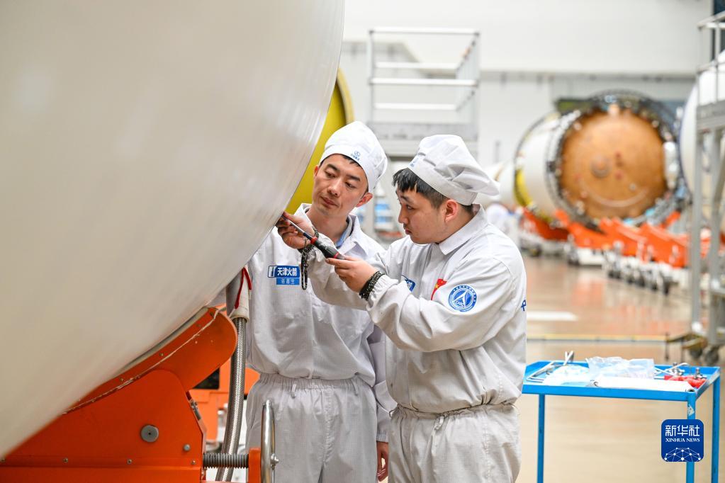 在航天科技集團一院天津火箭公司總裝測試車(chē)間,駱鑫生(左)指導“00后”班組成員彭澤裝配(4月19日攝)。