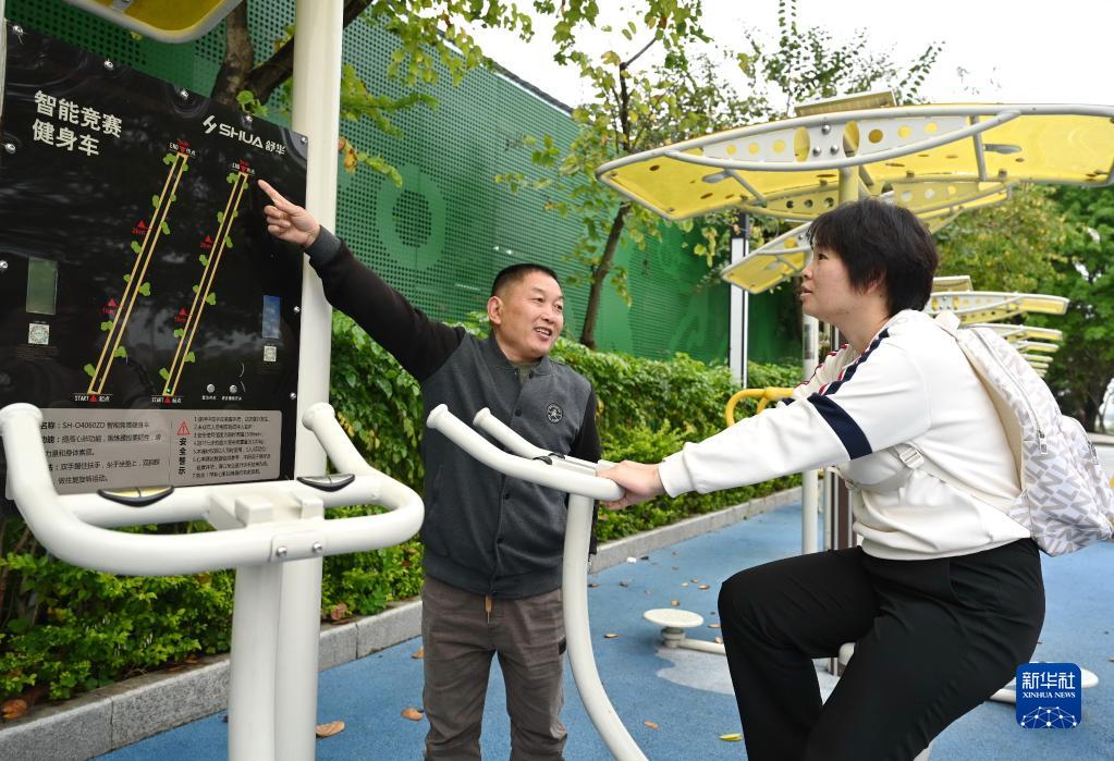 4月24日,西河智慧體育公園工作人員(左)向晨練的市民介紹具備對運動(dòng)數據進(jìn)行采集、分析等多項功能的智能競賽健身車(chē)。