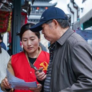 4月24日,在建德市梅城鎮古街一家商鋪內,志愿者在進(jìn)行亞運知識宣傳。