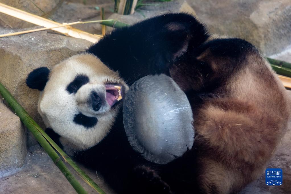 4月24日,在成都大熊貓繁育研究基地,大熊貓“芝麻”抱著(zhù)“冰蛋糕”玩耍。 新華社發(fā)(陳居偉 攝)