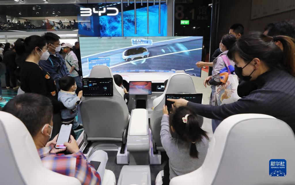 4月24日,參觀(guān)者在比亞迪汽車(chē)展臺體驗車(chē)輛智能感知系統模擬器。