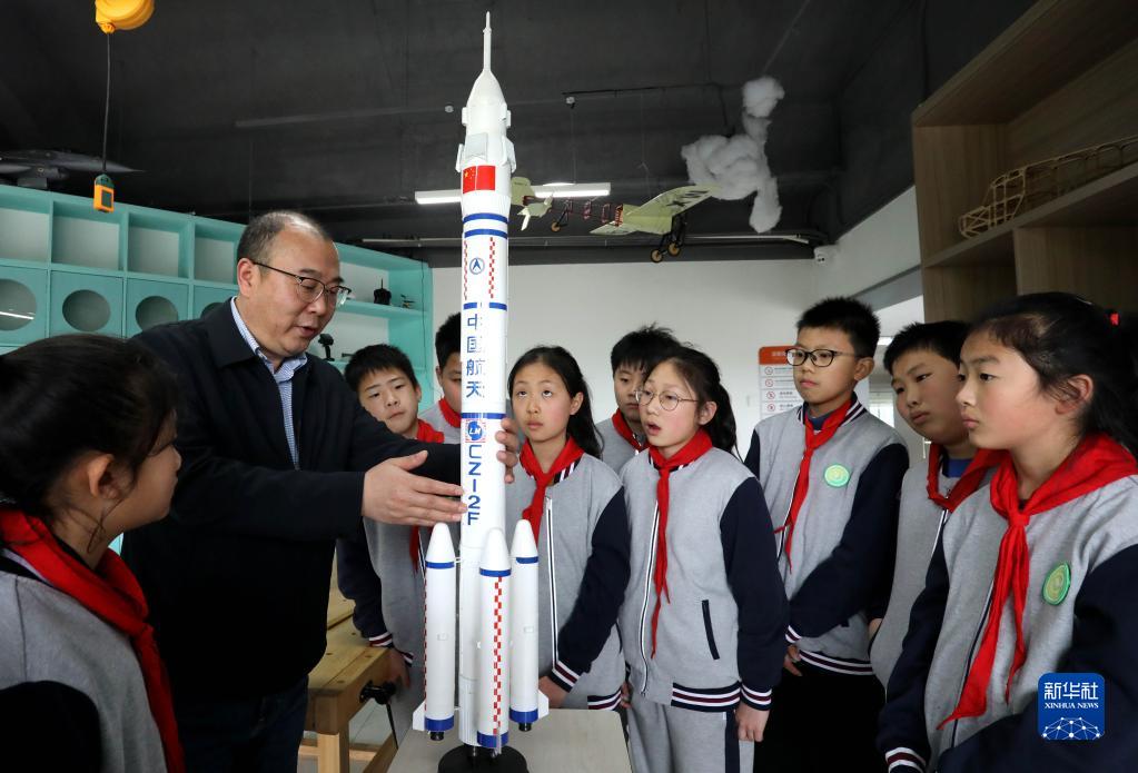 4月24日,在江蘇省蘇州市姑蘇區青少年宮科教實(shí)踐中心,科技輔導員為來(lái)參觀(guān)的學(xué)生介紹火箭模型。