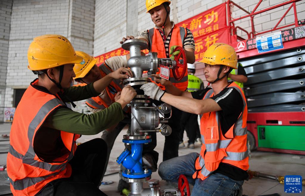 4月25日,在深圳前海泰康國際醫院項目工地,建筑工人參加閥門(mén)組裝工藝技能比拼。