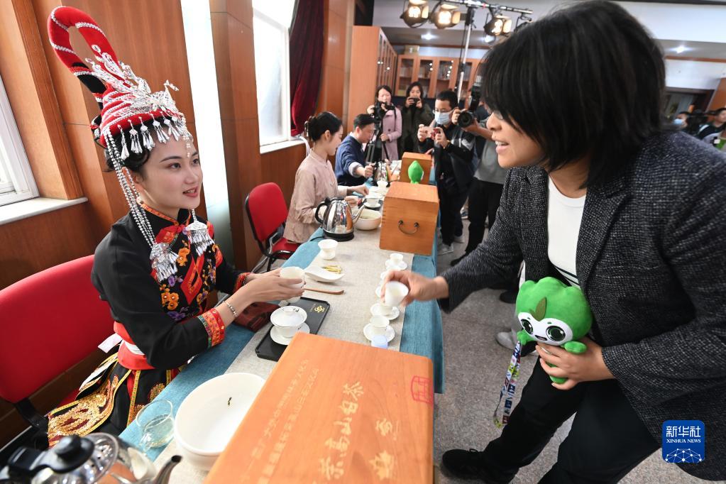 4月25日,來(lái)自柘榮縣的茶藝師(左)向新聞發(fā)布會(huì )參加者介紹高山白茶。