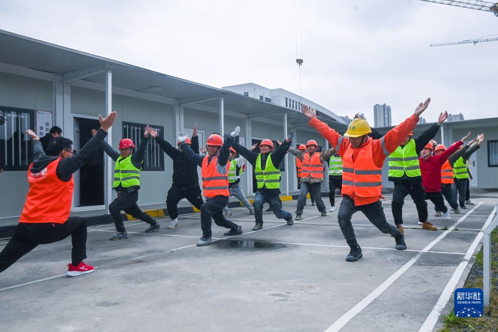 4月25日,社區工作人員帶領(lǐng)工地勞動(dòng)者學(xué)習簡(jiǎn)單的放松操。