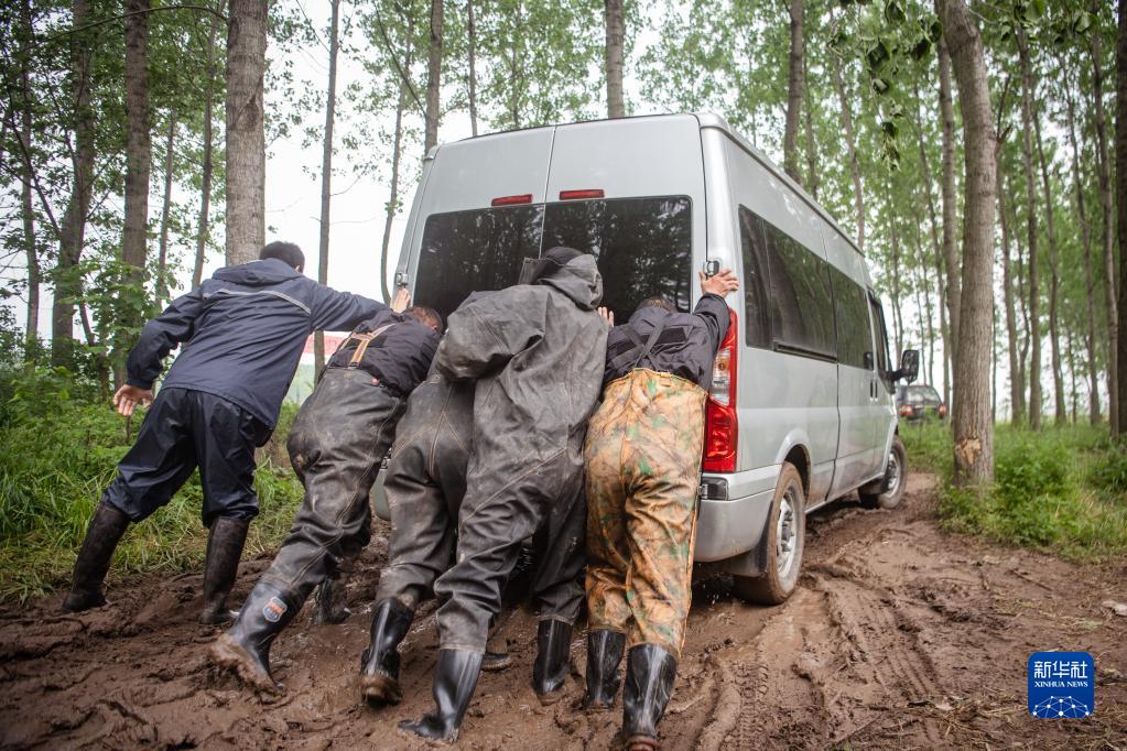 4月25日,工作人員合力推動(dòng)江豚運輸車(chē)輛駛過(guò)泥濘路面。