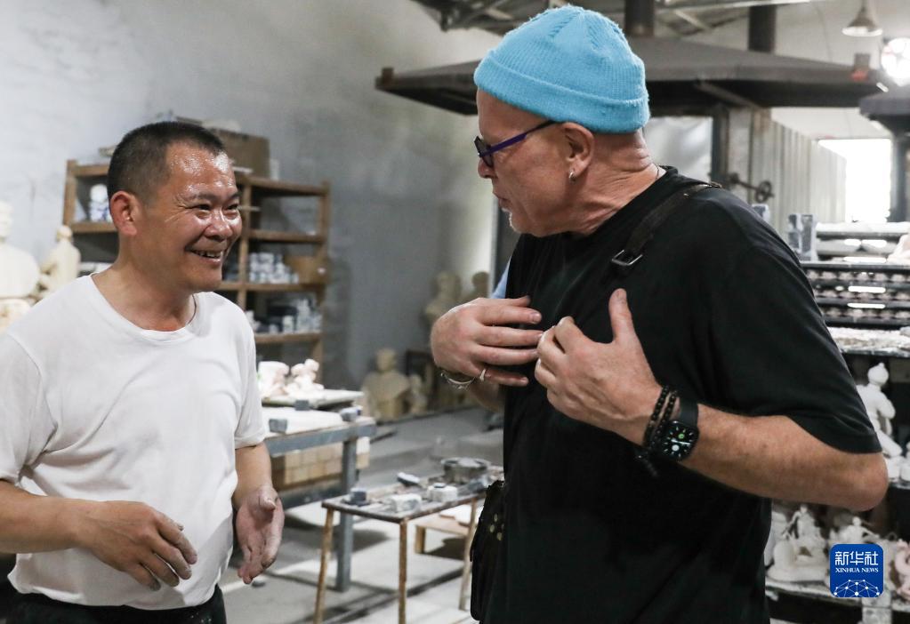 在江西景德鎮雕塑瓷廠(chǎng),托爾斯滕·尤雷爾與相熟的一名窯廠(chǎng)師傅寒暄(4月20日攝)。
