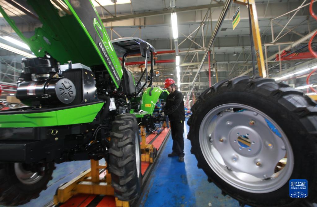 4月25日,在山東省臨沂市臨沭縣一家機械制造企業(yè),工人在車(chē)間內組裝農機產(chǎn)品。