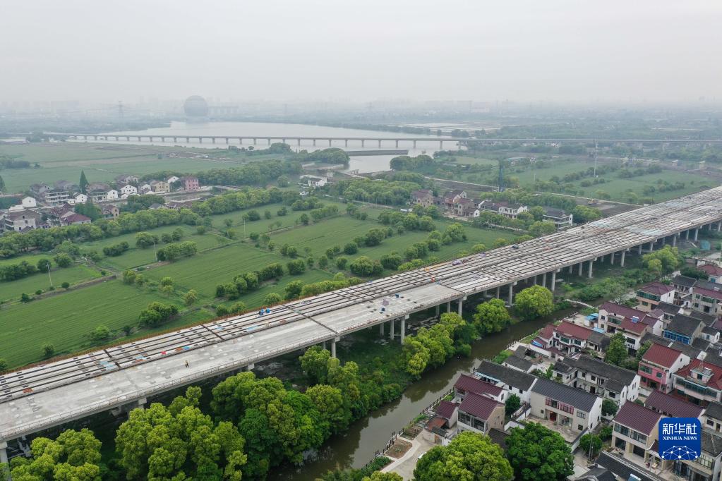 4月25日拍攝的蘇臺高速公路七都至桃源段ST-QL5標施工現場(chǎng)(無(wú)人機照片)。