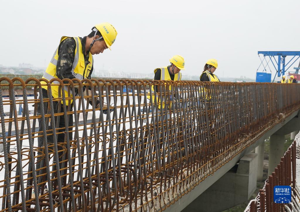 4月25日,中鐵二十局建設者在蘇臺高速公路七都至桃源段ST-QL5標施工現場(chǎng)綁扎鋼筋。