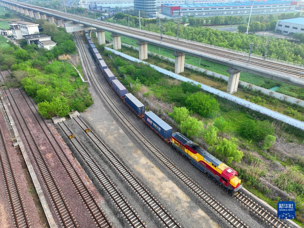 4月25日,江蘇首趟中老鐵路(海安—瑯勃拉邦)國際貨運列車(chē)化肥專(zhuān)列駛出南京貨運中心海安貨運站(無(wú)人機照片)。