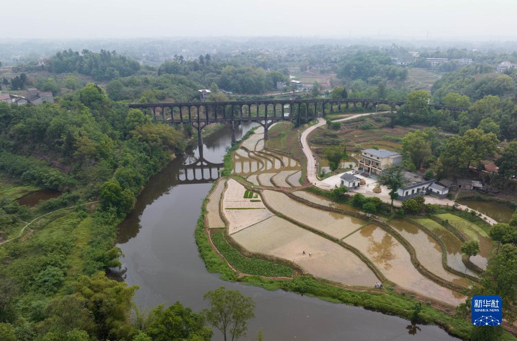4月25日在瀘縣奇峰鎮拍攝的勝利渡槽(無(wú)人機照片)??缭烬埾拥膭倮刹鄯稚舷聝蓪?,上層通水,下層為人行通道,非常獨特。