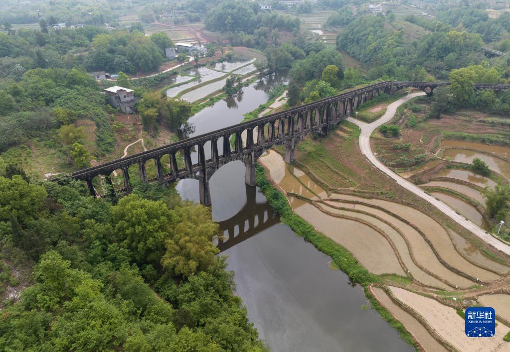 4月25日在瀘縣奇峰鎮拍攝的勝利渡槽(無(wú)人機照片)??缭烬埾拥膭倮刹鄯稚舷聝蓪?,上層通水,下層為人行通道,非常獨特。