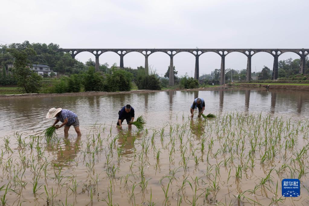 4月25日,在瀘縣奇峰鎮寶豐村,村民在寶藏渡槽附近的水田里插秧。