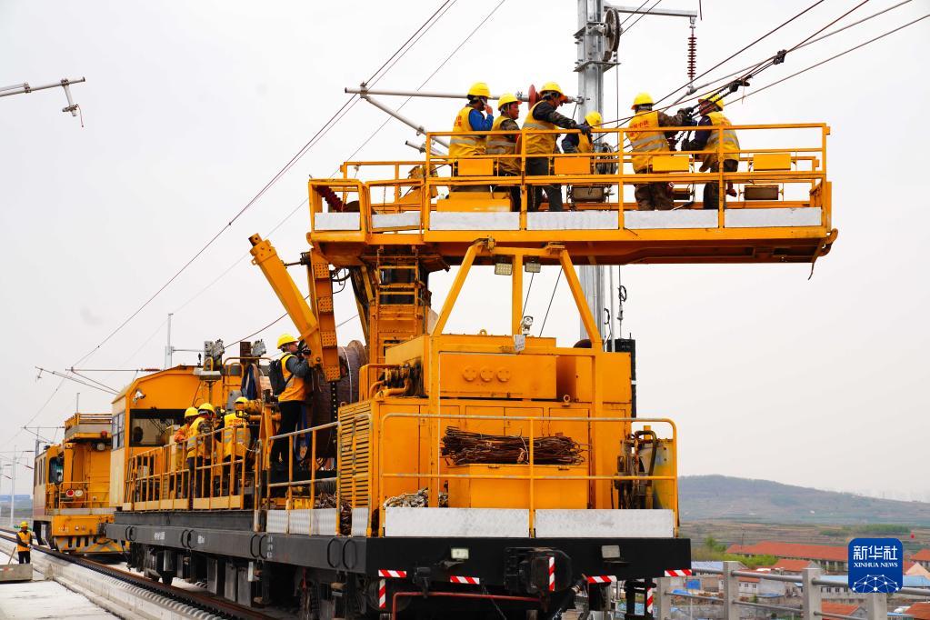 4月25日,在萊榮高鐵萊陽(yáng)南站至海陽(yáng)站區間,中鐵電氣化局的工作人員在進(jìn)行接觸網(wǎng)作業(yè)。