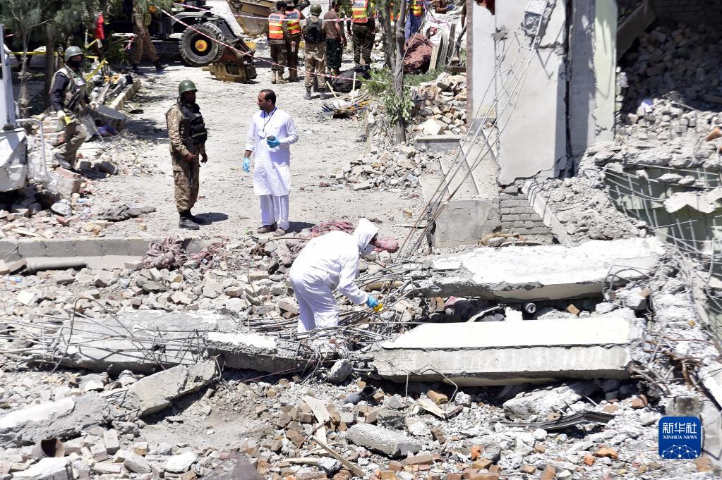 4月25日,安全人員在巴基斯坦斯瓦特地區卡巴爾鎮查看爆炸事件現場(chǎng)。