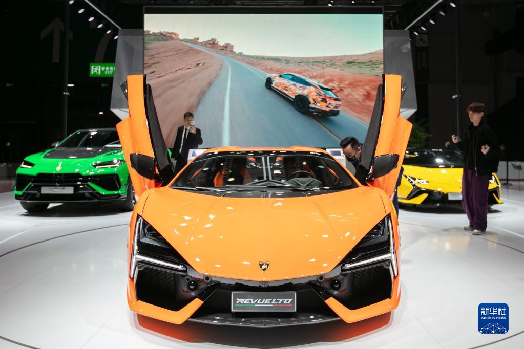 4月25日拍攝的在上海車(chē)展上進(jìn)行亞太首秀的蘭博基尼首款HPEV高性能V12混合動(dòng)力超級跑車(chē)Revuelto。