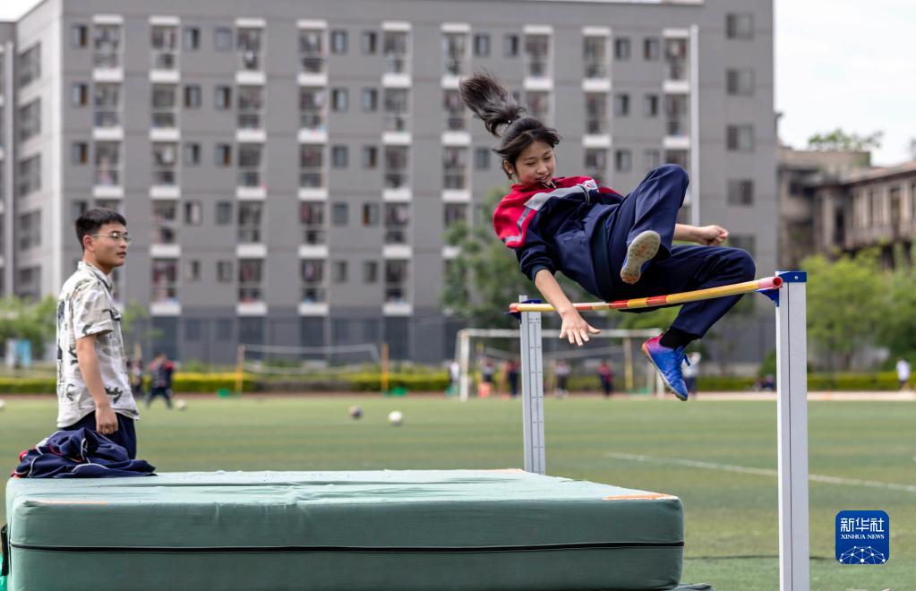 4月25日,在黔西第一中學(xué),學(xué)生在進(jìn)行田徑模塊跳高練習。