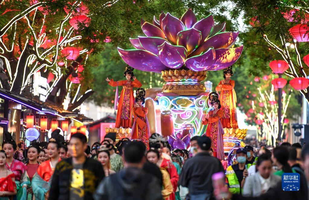 4月25日,花車(chē)巡游在西安大唐不夜城步行街舉行。