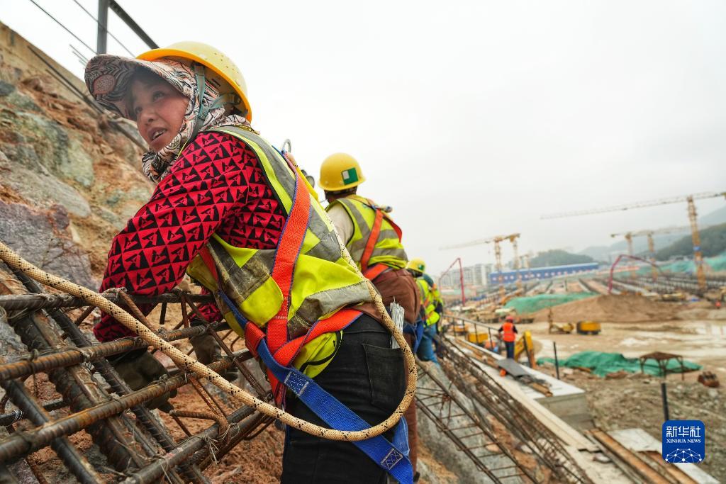 中鐵上海工程局施工人員在深圳地鐵5號線(xiàn)上水徑停車(chē)場(chǎng)建設現場(chǎng)綁扎護坡鋼筋籠(4月25日攝)。