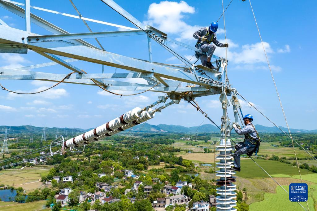 電力工人劉李家(上)、段信陽(yáng)在塔上作業(yè)(4月20日,無(wú)人機照片)。
