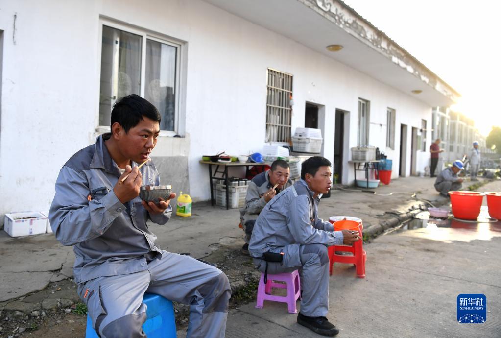 清晨六點(diǎn),電力工人劉李家、段信陽(yáng)、王春龍在吃早飯(4月20日攝)。
