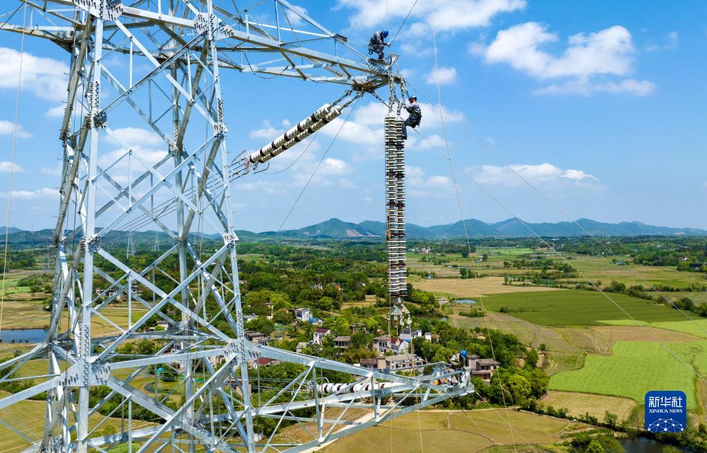電力工人劉李家(上)、段信陽(yáng)(中)、王春龍(下)在塔上作業(yè)(4月20日,無(wú)人機照片)。
