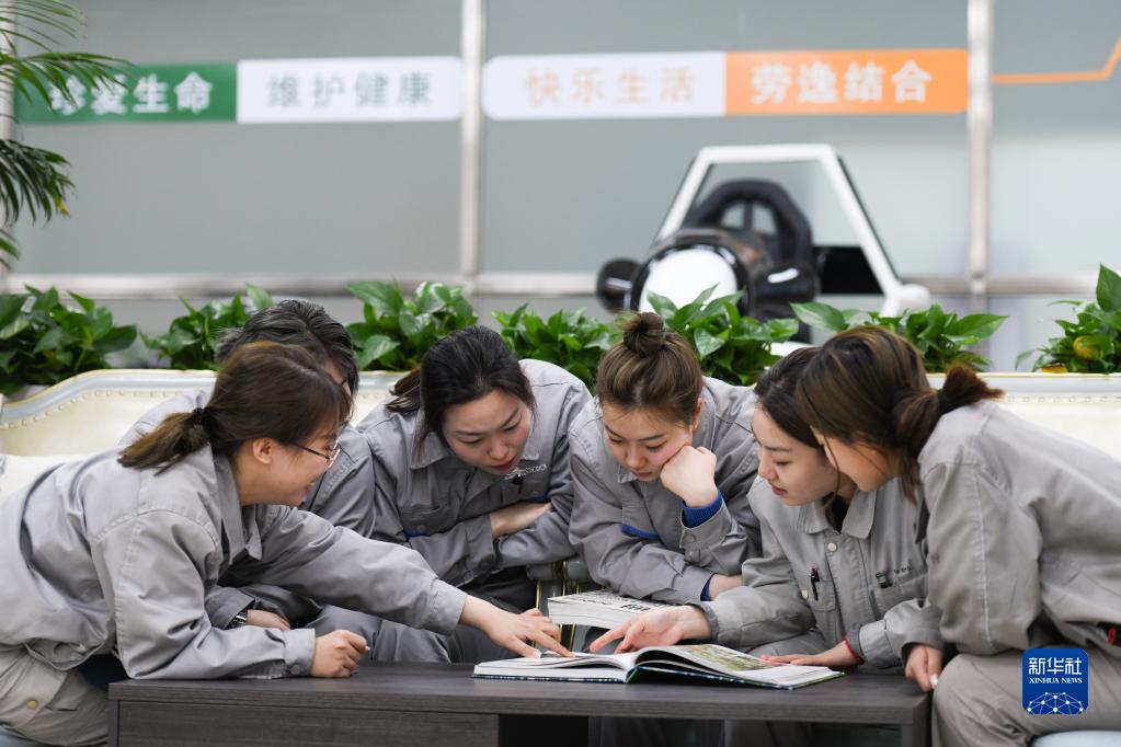 在哈爾濱動(dòng)車(chē)段,“雪絨花”女子班組部分成員在休息室中聊天(4月25日攝)。