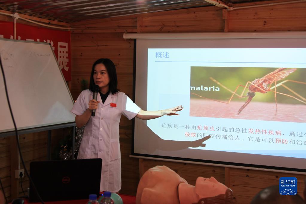 4月25日,在津巴布韋阿卡迪亞礦區,中國第20批援津巴布韋醫療隊隊員介紹防瘧疾知識。