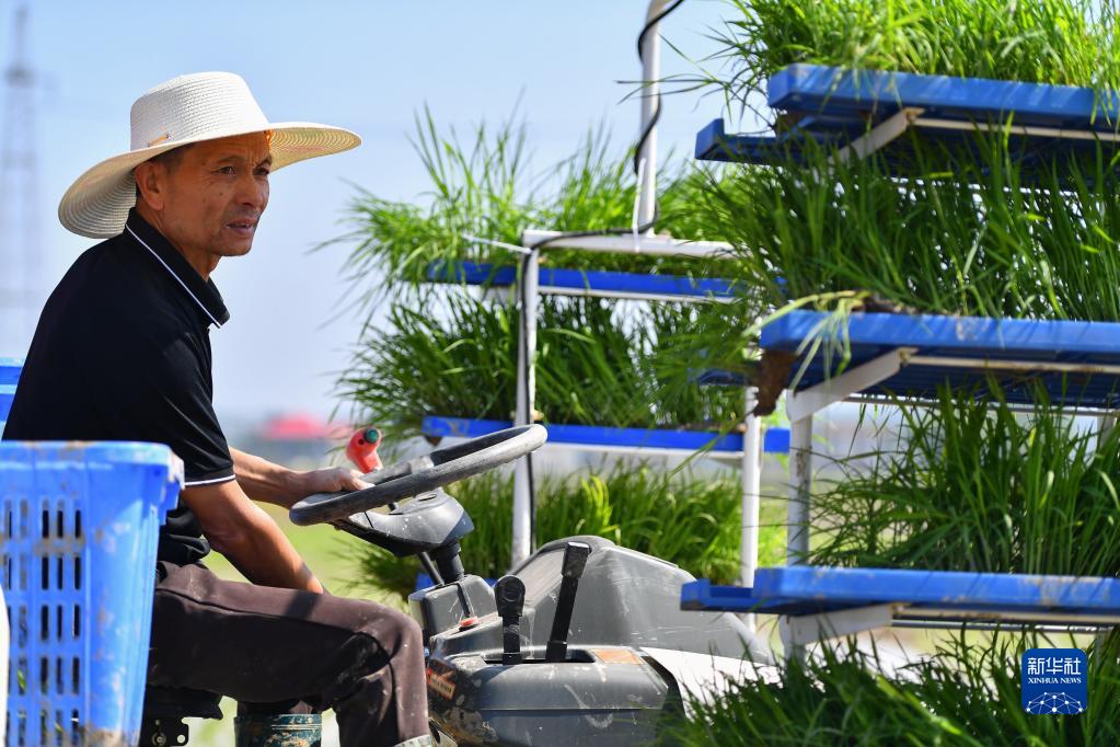 4月26日,在湘潭市雨湖區姜畬鎮易建河村的一處高標準農田,農民駕駛插秧機插秧。