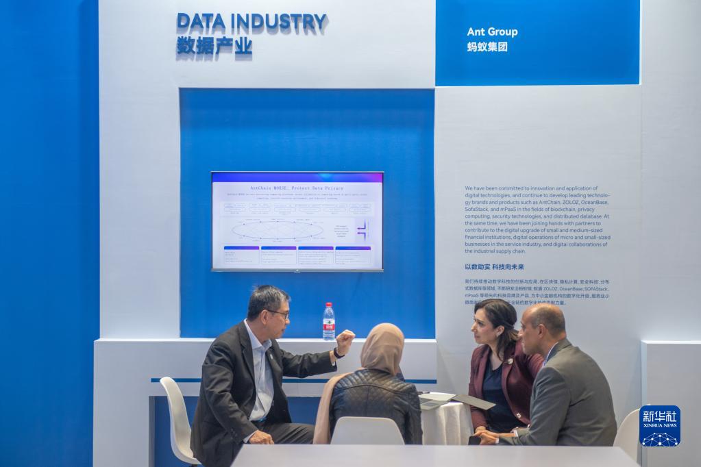 4月26日,在數據產(chǎn)業(yè)展區,螞蟻集團代表(左一)為參觀(guān)者講解。