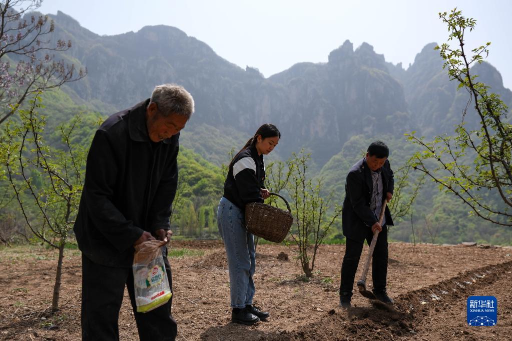 陳曉麗(中)協(xié)助村民馬云昌(右)種土豆(4月18日攝)。新華社記者 張鋮 攝