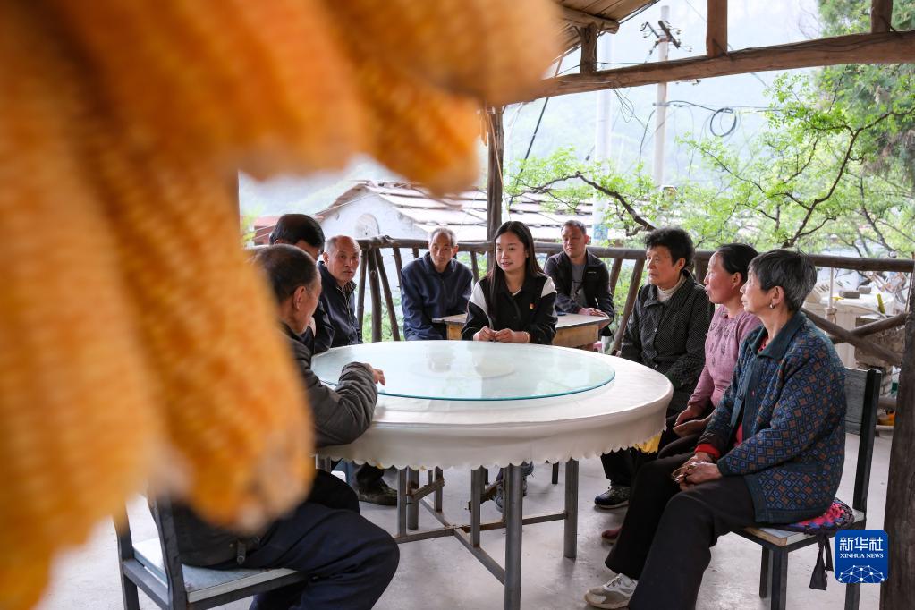 陳曉麗(中)同村干部和村民代表商討村里老房子改造事宜(4月18日攝)。新華社記者 張鋮 攝