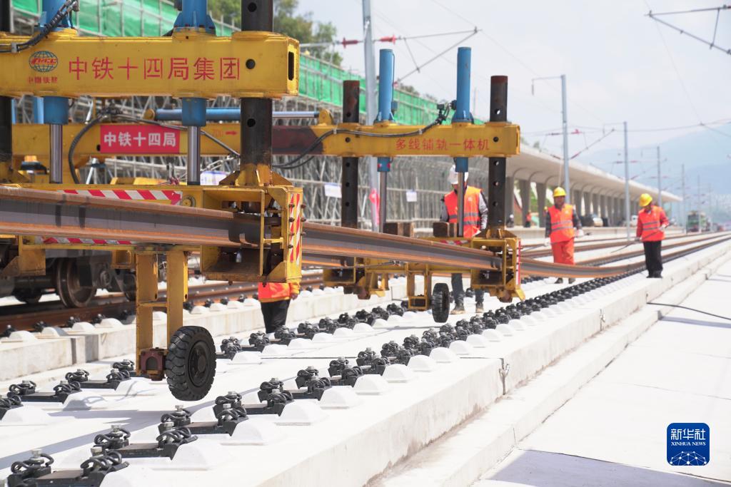 4月26日,在昌景黃高鐵浮梁東站施工現場(chǎng),工作人員利用機械將鋼軌放入承軌槽。