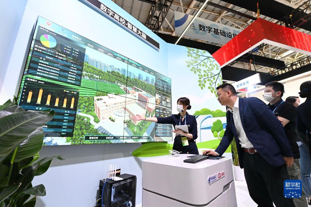 4月26日,數字福建建設成果專(zhuān)區工作人員在展覽現場(chǎng)向參觀(guān)者介紹數字高校智慧大腦綜合管理平臺,該平臺由福建師范大學(xué)和中國電信福州分公司聯(lián)手打造。