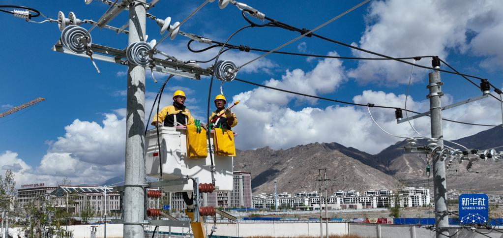 4月26日,扎西尼瑪(右)和徒弟在進(jìn)行高空帶電作業(yè)演練(無(wú)人機照片)。