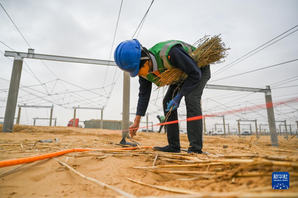 近日,在內蒙古自治區杭錦旗億利庫布其沙漠光伏治沙基地,工人們忙著(zhù)在光伏架下種植耐旱苗木,用于防風(fēng)固沙。目前,億利庫布其沙漠光伏治沙基地正在建設中,此次規劃種植面積上萬(wàn)畝。