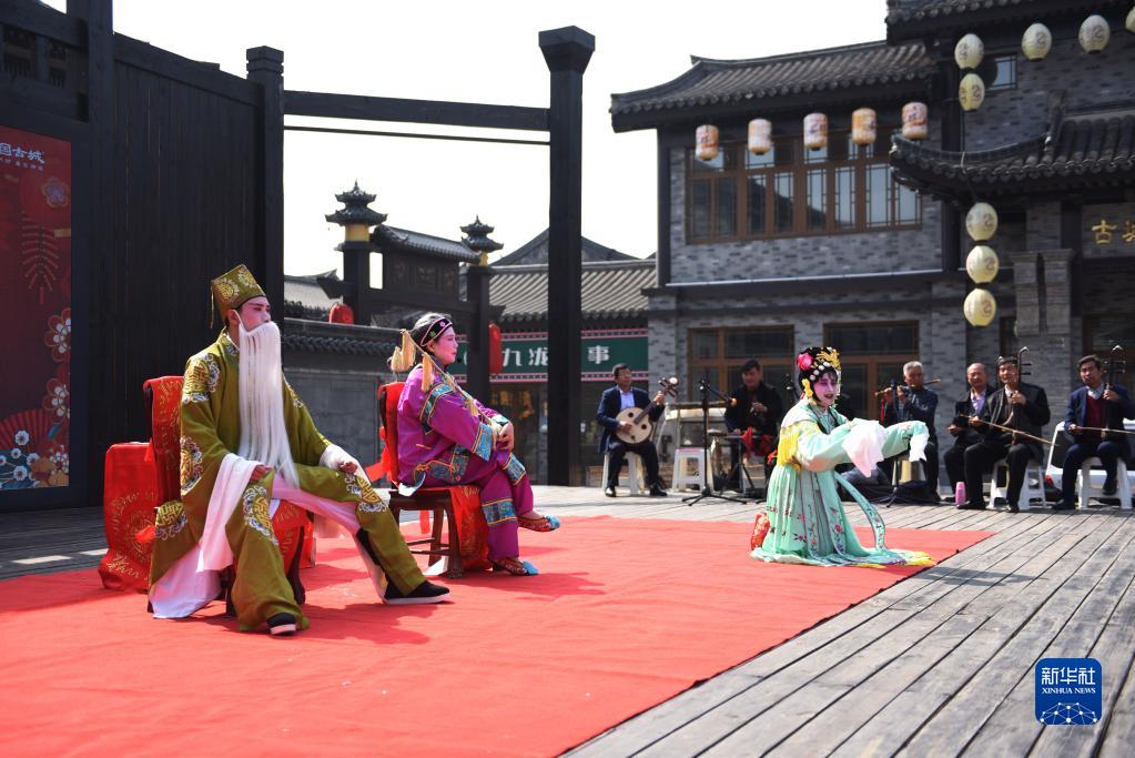 4月26日,演員在山東省臨沂市郯城縣郯國古城景區表演柳琴戲。