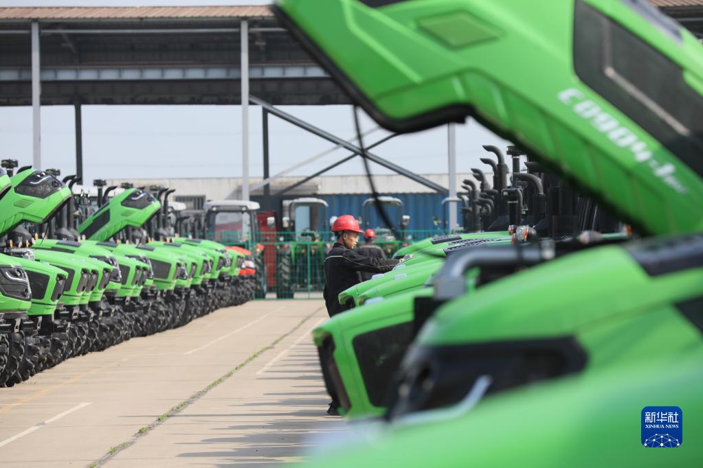 4月26日,在山東省臨沂市臨沭縣一家農業(yè)機械制造企業(yè),工人在堆場(chǎng)查驗出口機械。