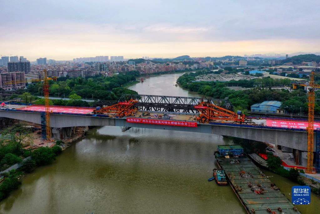 流溪河特大橋重達千噸的鋼箱梁主梁合龍(4月27日攝,無(wú)人機照片)。