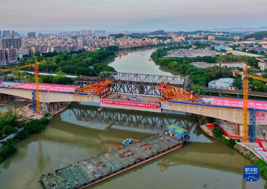 流溪河特大橋重達千噸的鋼箱梁主梁進(jìn)行吊裝作業(yè),在主控計算機精準操控下合龍間隙僅5毫米(4月26日攝,無(wú)人機照片)。