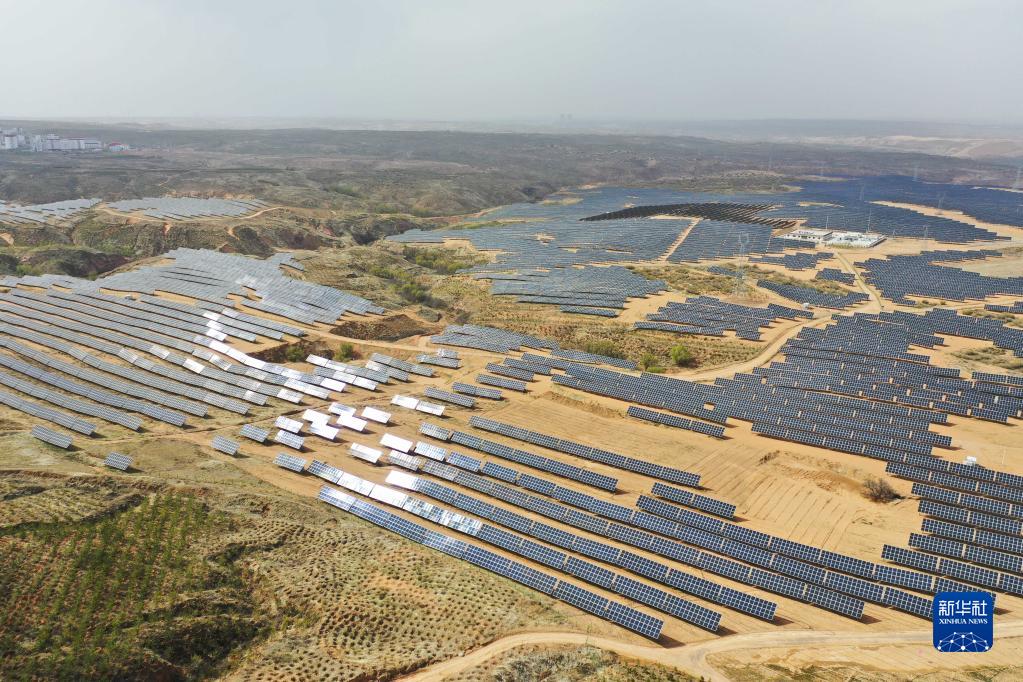 4月26日在內蒙古鄂爾多斯市伊金霍洛旗拍攝的天驕綠能50萬(wàn)千瓦光伏項目(無(wú)人機照片)。