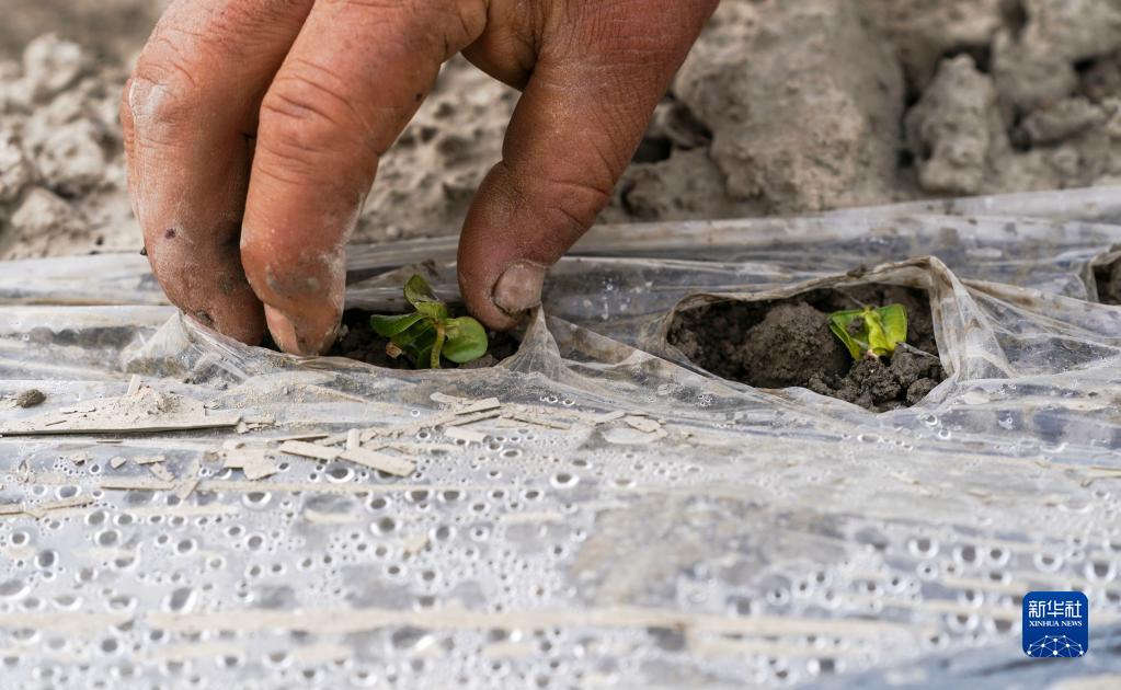 新疆尉犁縣巴西買(mǎi)里村,爾肯·熱衣木用手撥開(kāi)地膜,讓棉花嫩芽鉆出(4月22日攝)。因為地勢變化等原因,即使松土設備駛過(guò),仍有一些棉花嫩芽無(wú)法鉆出地膜。