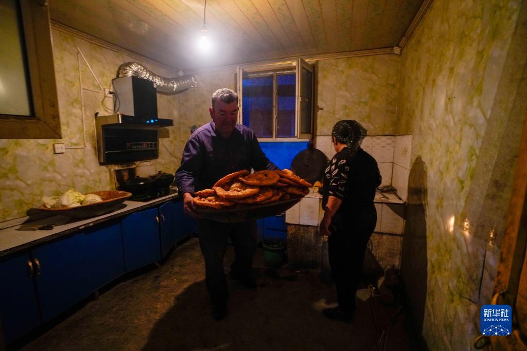新疆尉犁縣巴西買(mǎi)里村,回到家中,爾肯·熱衣木幫著(zhù)愛(ài)人一起炸油餅(4月21日攝)。