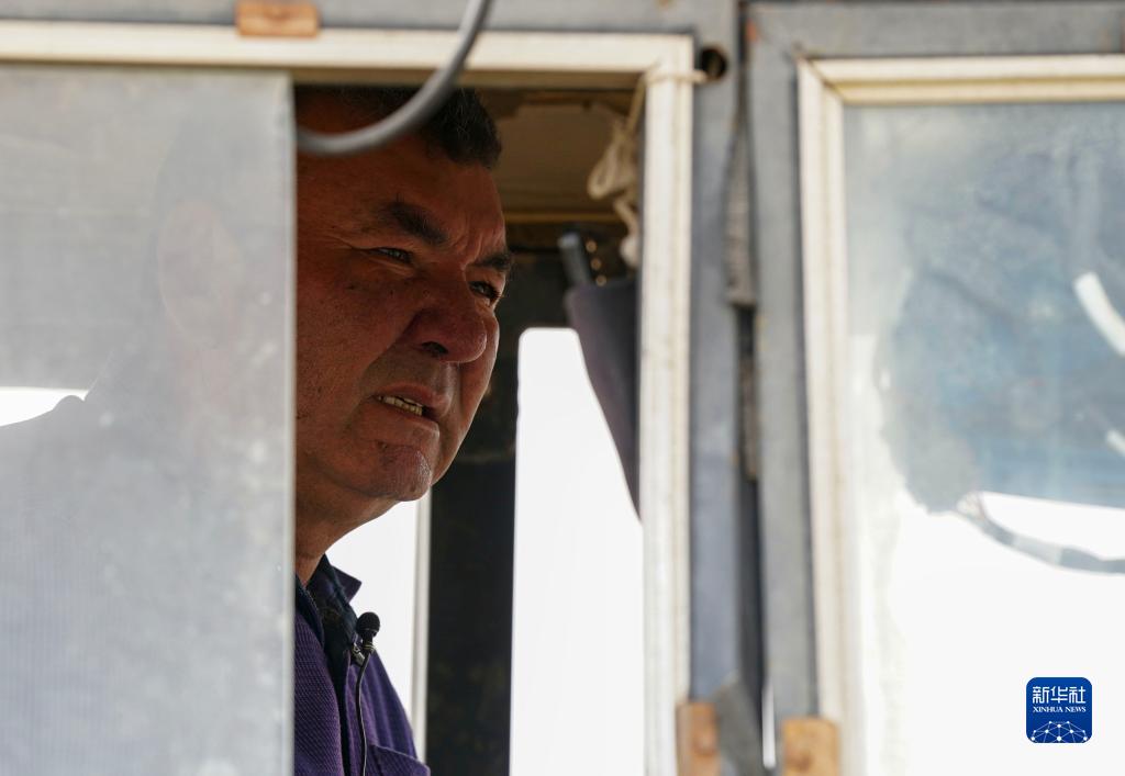 新疆尉犁縣巴西買(mǎi)里村,爾肯·熱衣木坐在拖拉機里,看著(zhù)鋪膜和播種情況(4月21日攝)。