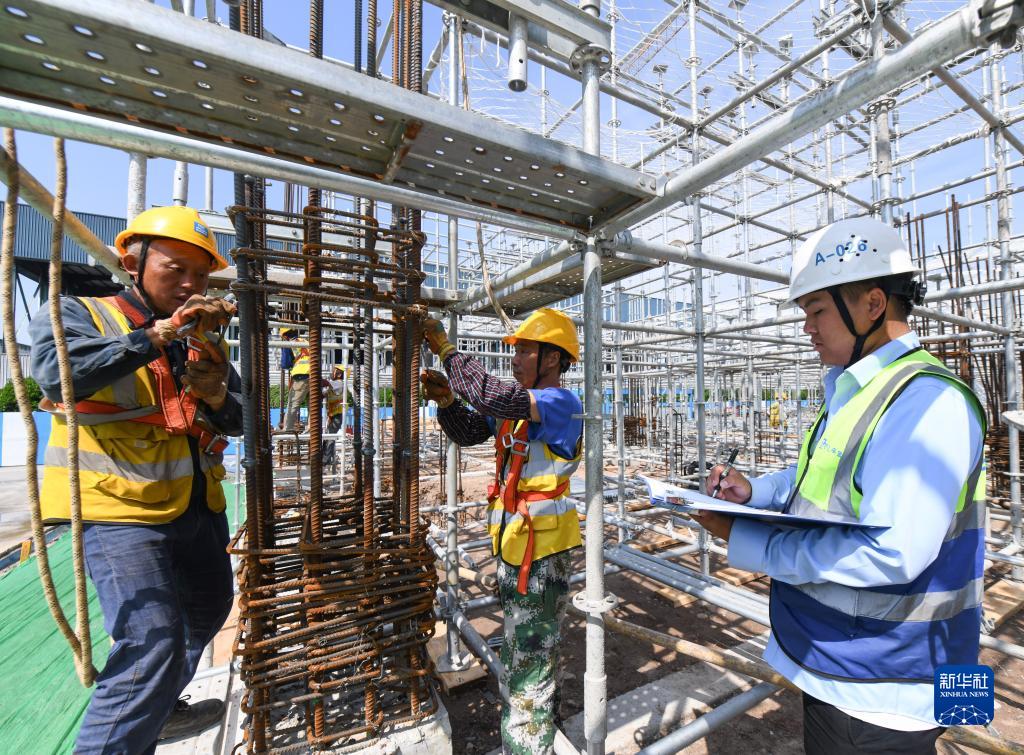 4月27日,在中建安裝集團有限公司位于四川遂寧市射洪市的廠(chǎng)房增產(chǎn)擴能項目建設現場(chǎng),記分員(右)在柱鋼筋綁扎比賽項目中打分。