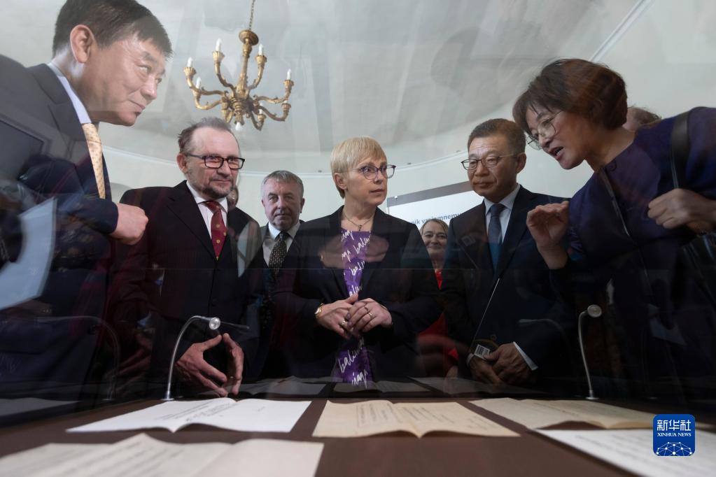4月26日,在斯洛文尼亞盧布爾雅那的斯洛文尼亞共和國檔案館,斯洛文尼亞總統穆薩爾(中)在劉松齡與璣衡撫辰儀文獻展上聽(tīng)取專(zhuān)家講解。